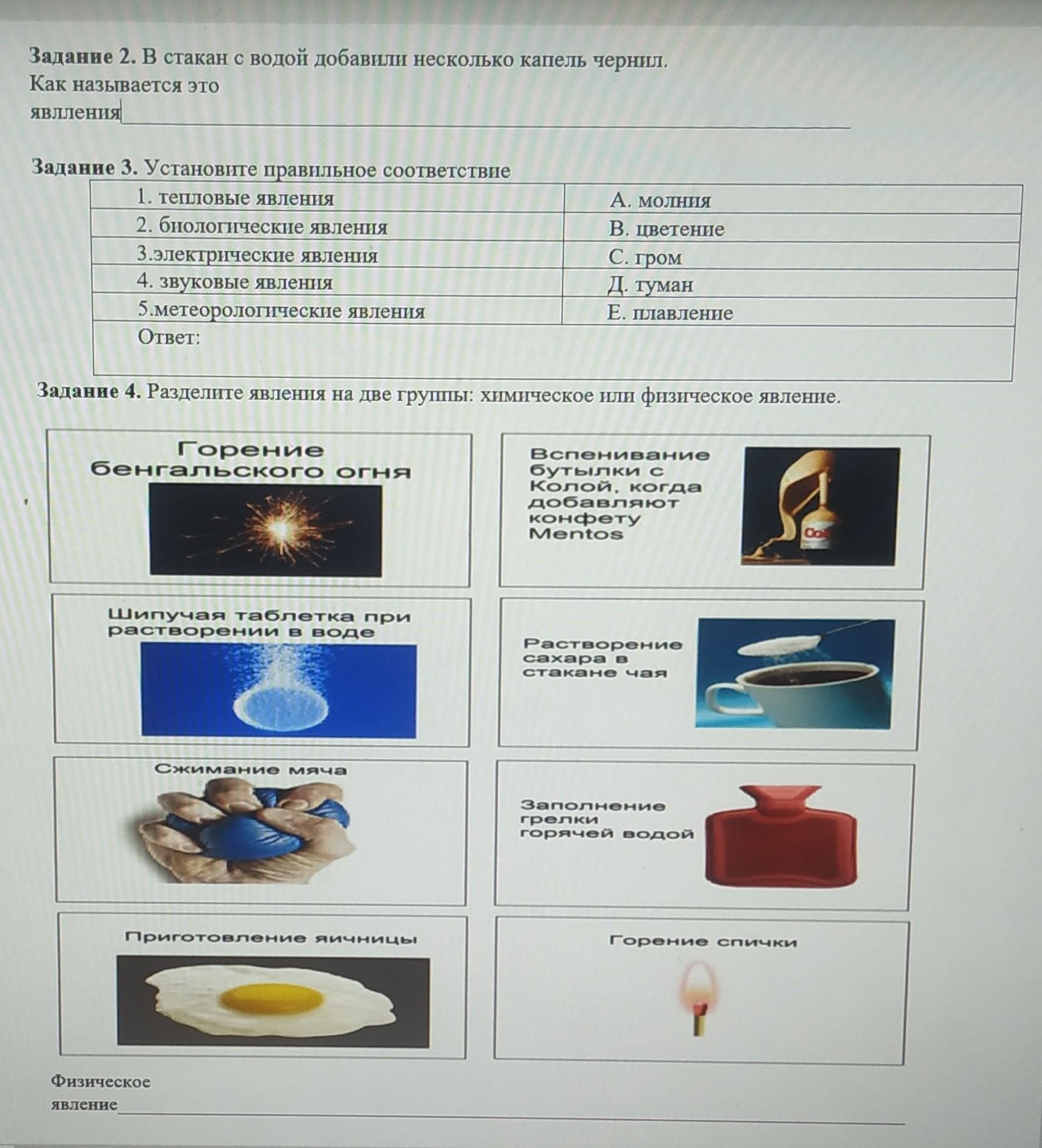 физ: бенгальский огонь, сжимание мяча, яичница, горение спички, растворение сахара в чае