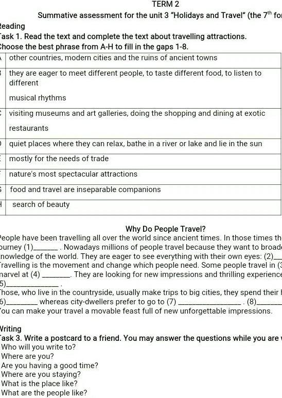 TERM 2 Summative assessment the unit 3 "Holidays and Travel" (the 7th form) Reading Task 1. Read the text and complete the text about travelling attractions. Choose the best phrase from A-H to fill in the gaps 1-8.