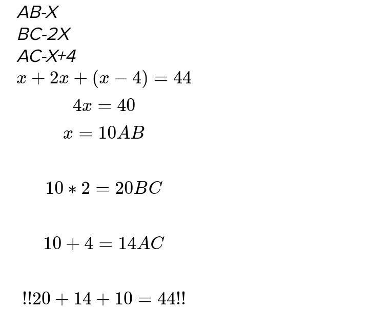 1. Периметр треугольника АВС равен 64 см. Сторона АВ вдвое меньше стороны ВС и на 4 см меньше стороны АС. Найдите длины сторон.