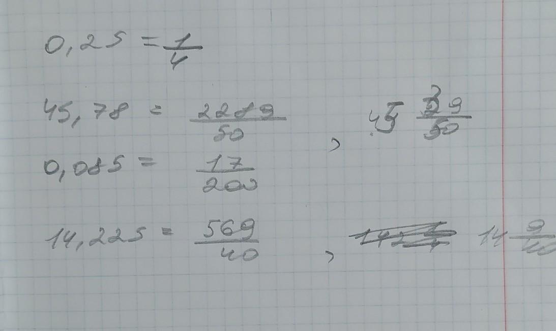 представьте дысятичную дробь 0,25 45,78 0,085 14,225 в виде обыкновенной нужно еще сокращать помагите