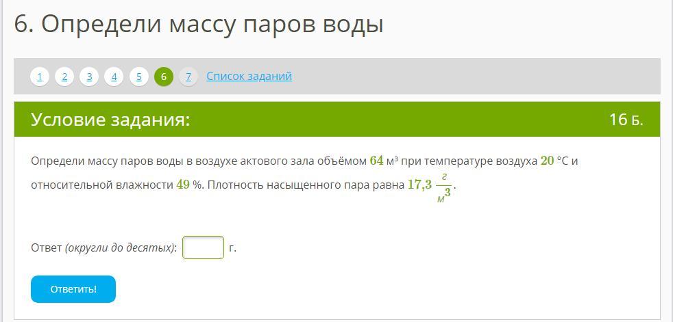 Определи массу паров воды в воздухе актового зала объёмом 64 м³ при температуре воздуха 20 °С и относительной влажности 49 %. Плотность насыщенного пара равна 17,3 гм3.