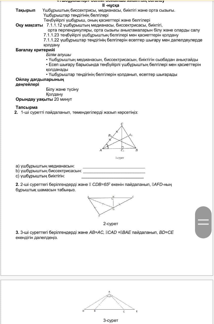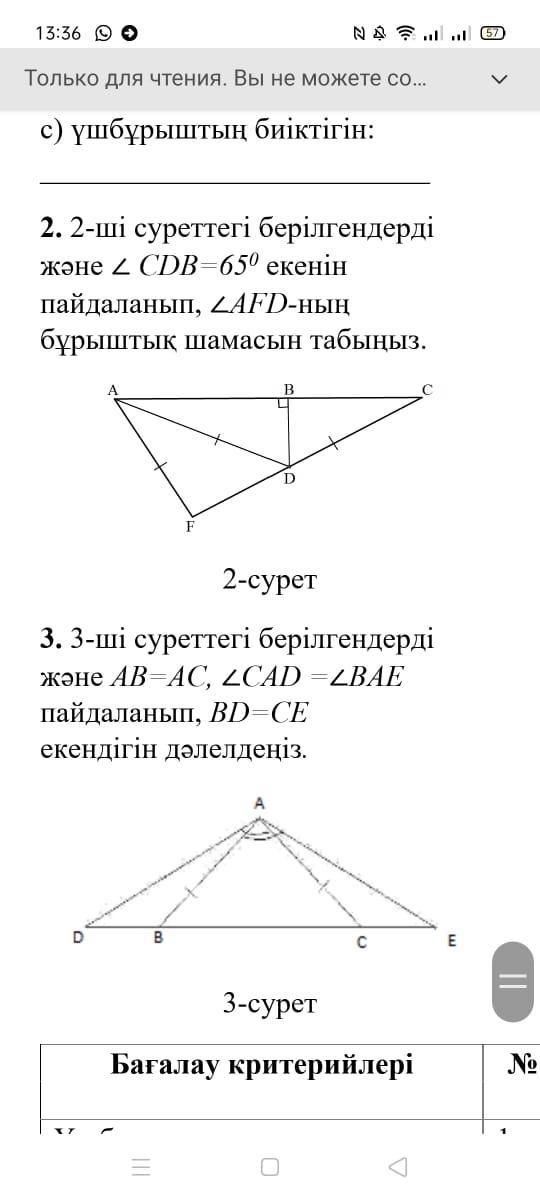 2)Найдите угловую величину AFD, используя приведенные на рисунке 2 и то, что CDB=65 3)Докажите , что дано на рис.3 и что AB=AC, CAD=BAE BD=CE.