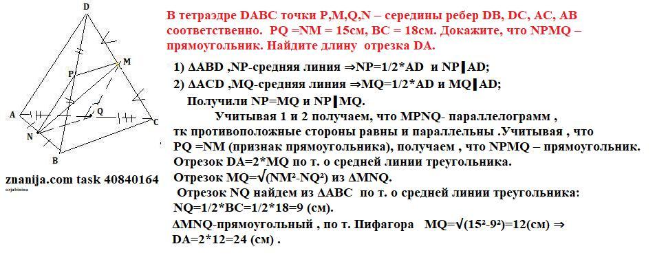 В тетраэдре DАВС точки P,М,Q,N – середины ребер DВ, DС, АС, АВ соответственно. РQ =NM = 15cм, ВC = 18cм. Докажите, что NPMQ – прямоугольник. Найдите длину отрезка DА.
