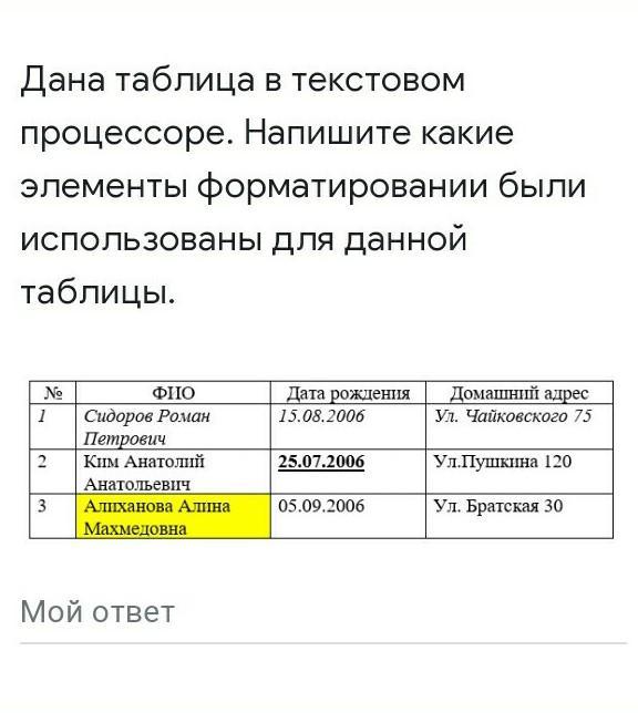 Дана таблица в текстовом процессоре. Напишите какие элементы форматировании были использованы для данной таблицы.