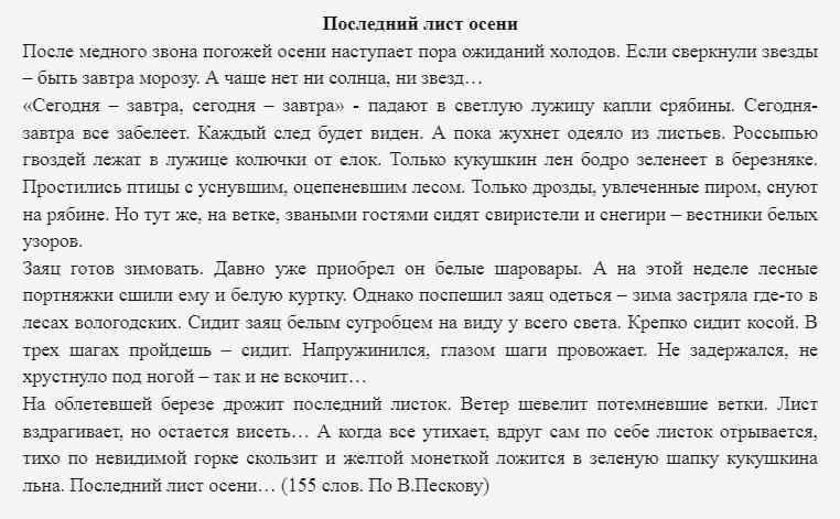 Помогите пожалуйста завтра надо сдавать а у меня не готово изложение 6 класс последний лист осени есть предложения сегодня завтра сегодня завтра. Россыпью гроздей лежат в лужице колючки от ёлок только кукушкин лён бодро зеленеет