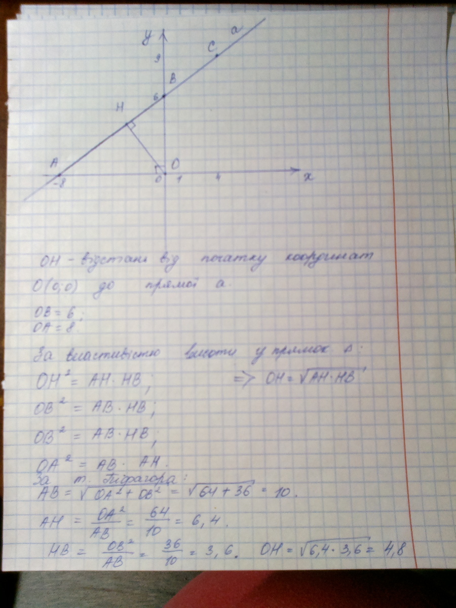 Пряма проходить через точки (0;6) і (4;9). На якій відстані від початку координат проходить ця пряма?
