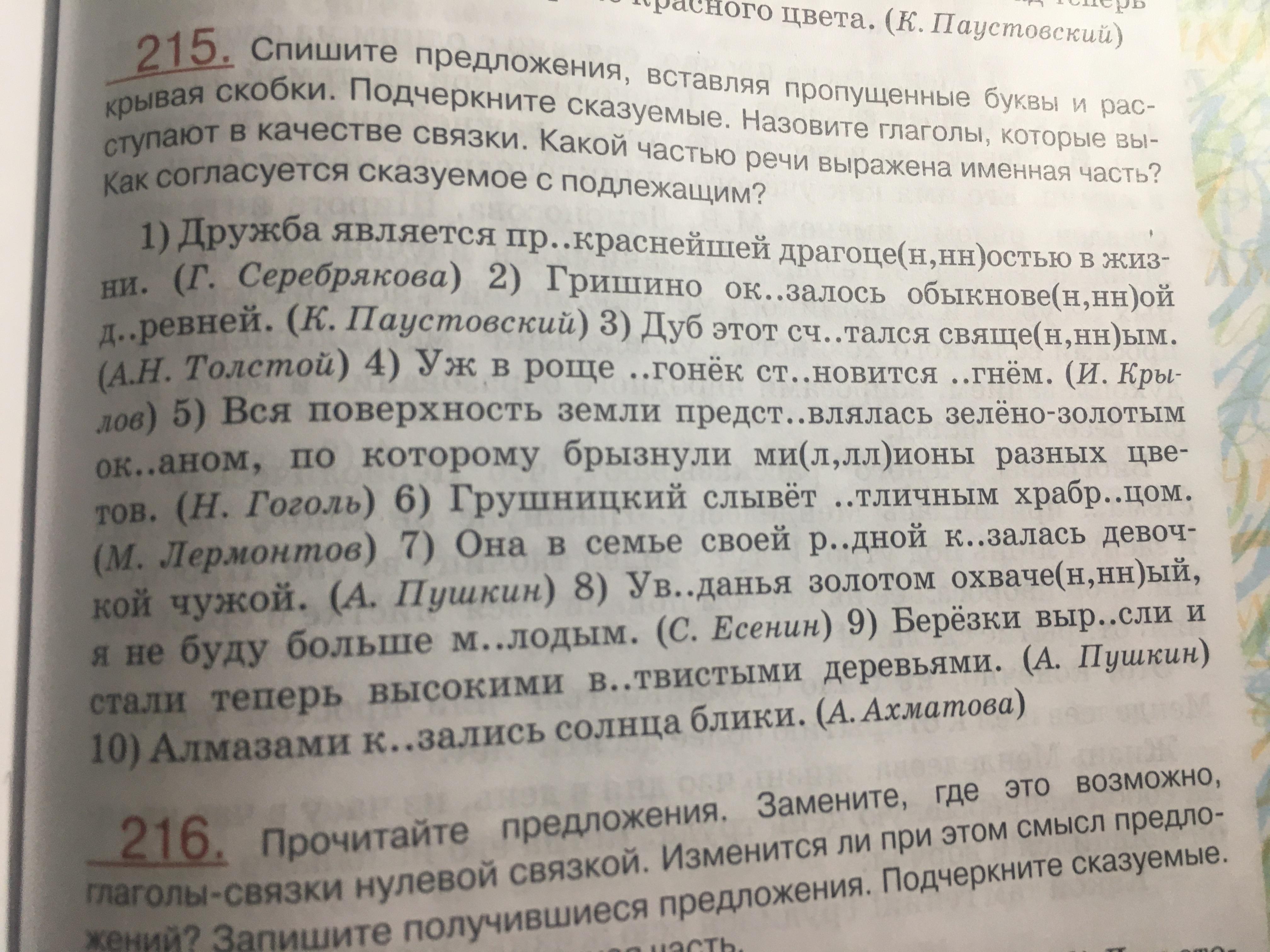 1) Дружба является пр..краснейшей драгоце(н, нн)остью в жизни. (Г. Серебрякова) 2) Гришино ок.залось обыкнове(н, нн)ой д.ревней. (К. Паустовский) 3) Дуб этот сч.тался свяще(н, нн)ым. (А.Н. Толстои) 4) Уж в роще гонёк ст.новится ..гнём. (И. Кры лов) 5) Вся поверхность земли предст..влялась зелёно-золотым ок..аном, по которому брызнули ми(л,лл)ионы разных цветов. (Н. Гоголь) 6) Грушницкий слывёт тличным храбр..цом. (М. Лермонтов) 7) Она в семье своей р..дной к..залась девочкой чужой. (А. Пушкин) 8) Ув..данья золотом охваче(н, нн)ый, я не буду больше м..лодым. (С. Есенин) 9) Берёзки выр..сли и стали теперь высокими в..твистыми деревьями. (А. Пушкин) 10) Алмазами к..зались солнца блики. (А. Ахматова)