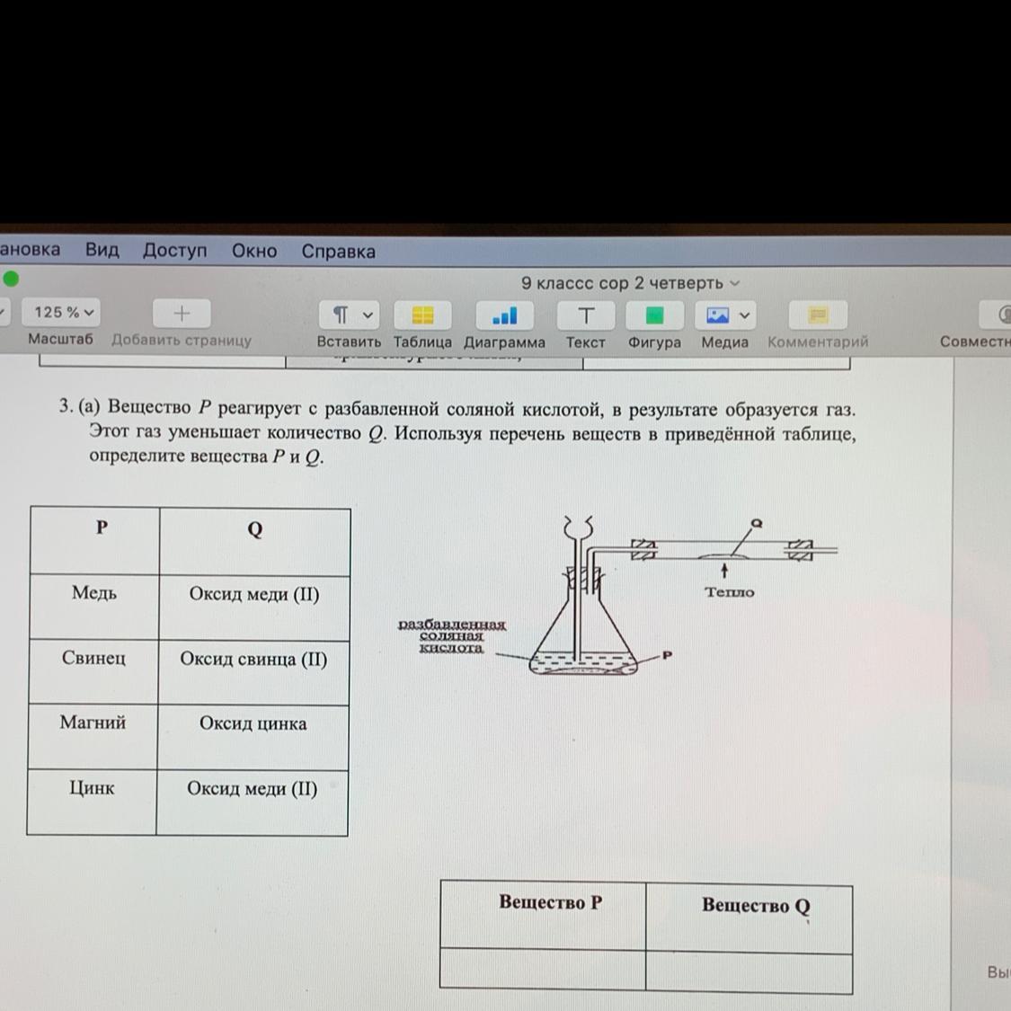3. (а) Вещество Р реагирует с разбавленной соляной кислотой, в результате образуется газ. Этот газ уменьшает количество Q. Используя перечень веществ в приведённой таблице, определите вещества P и Q