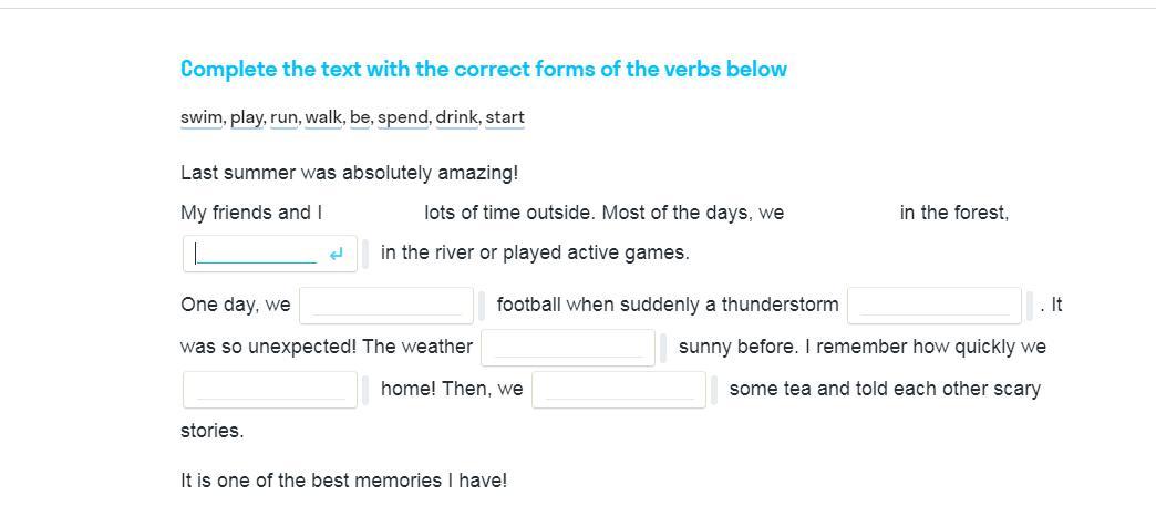 One day, we were playing football when suddenly a thunderstorms started. It was so unexpected! The weather had been sunny before. I remember how quickly we ran home! Then, we drank some tea and told each other scary stories.