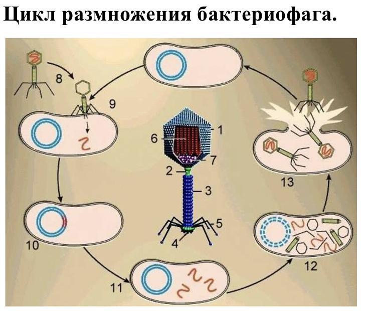 4)перестройка всего метаболизма бактериальной клетки и синтез ДНК и фагового белка бактериофага