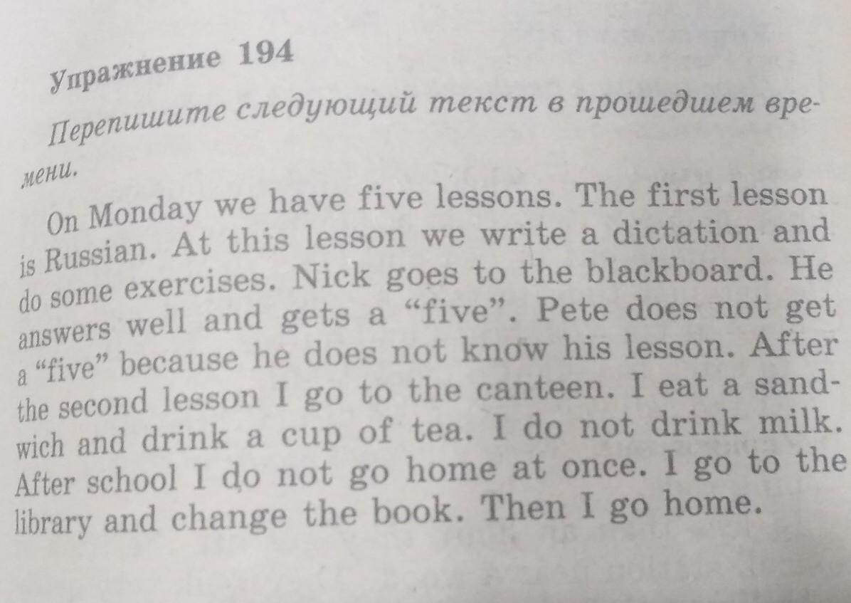 On Monday we had five lessons. The first lesson was Russian. At this lesson we wrote a dictation and did some exercises. Nick went to the blackboard. He answered well and got a "five". Pete didn't get a "five" because he didn't know his lesson. After the second lesson I went to the canteen. I ate a sandwich and drank a cup of tea. I didn't drink milk. After school I didn't go home at once. I went to the library and changed the book. Then I went home.