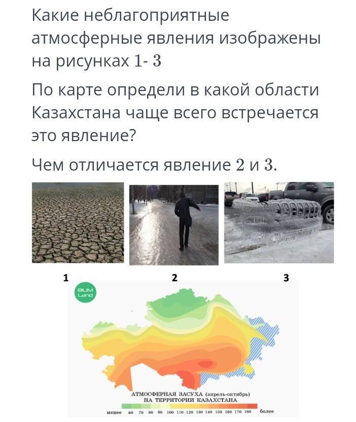 какие неблагоприятные атмосферные явления изображены на рисунках 1-3 По карте определи в какой области Казахстане чаще встречается это явление? чем отличаетс явление 2и3