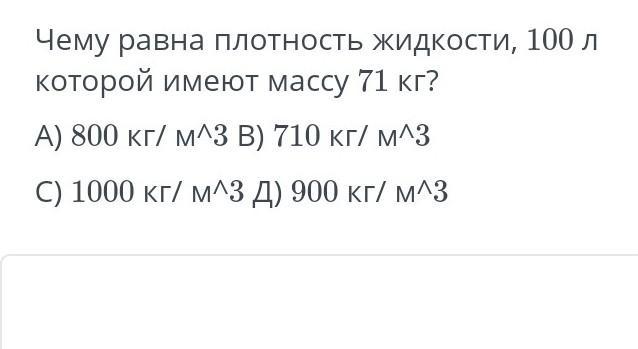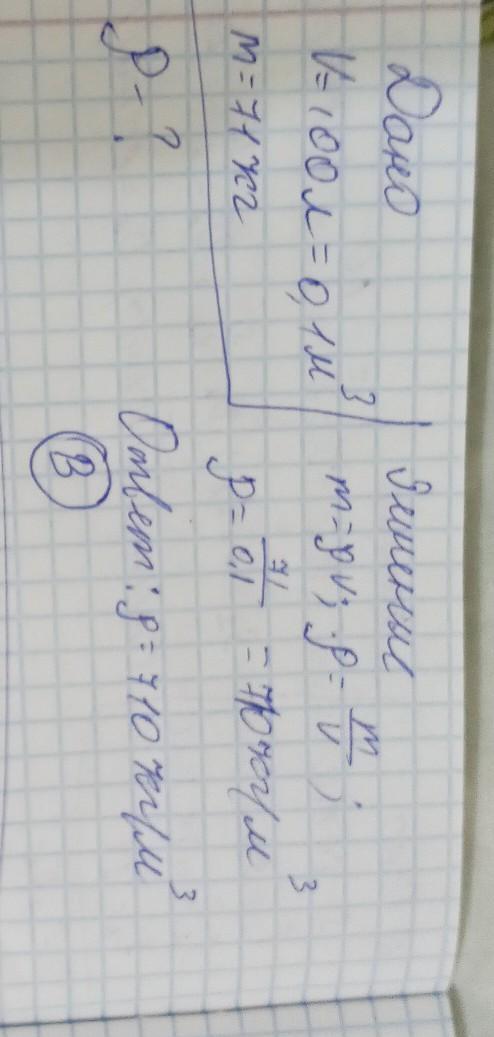 Чему равен плотность жидкости, 100 л которой имеют массу 71 кг? А) 800 кг/ м^3 В) 710 кг/ м^3 С) 1000 кг/ м^3 Д) 900 кг/ м^3