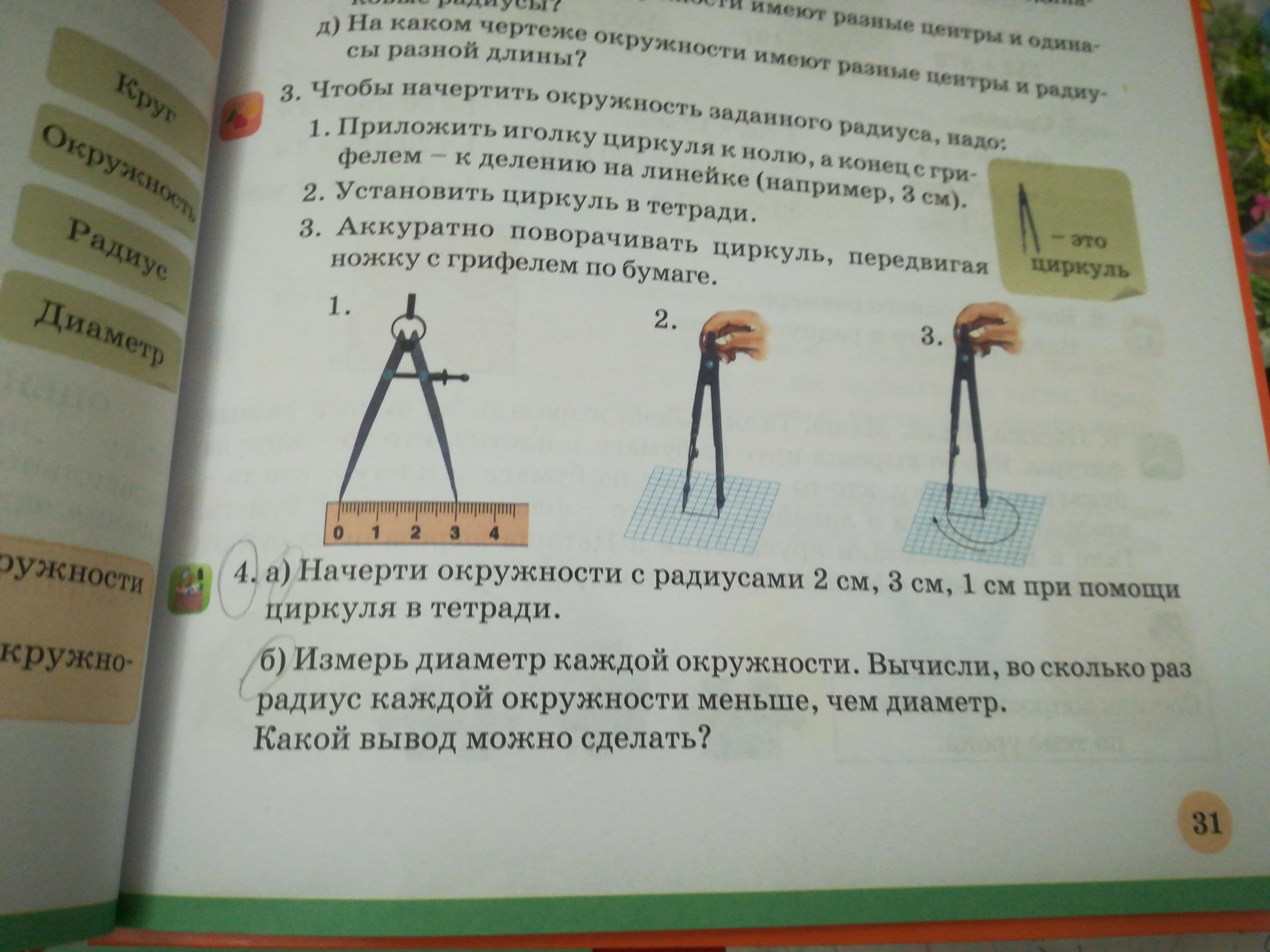 если берет 2,отменяем на линейке и черти окружность с радиусом 2.