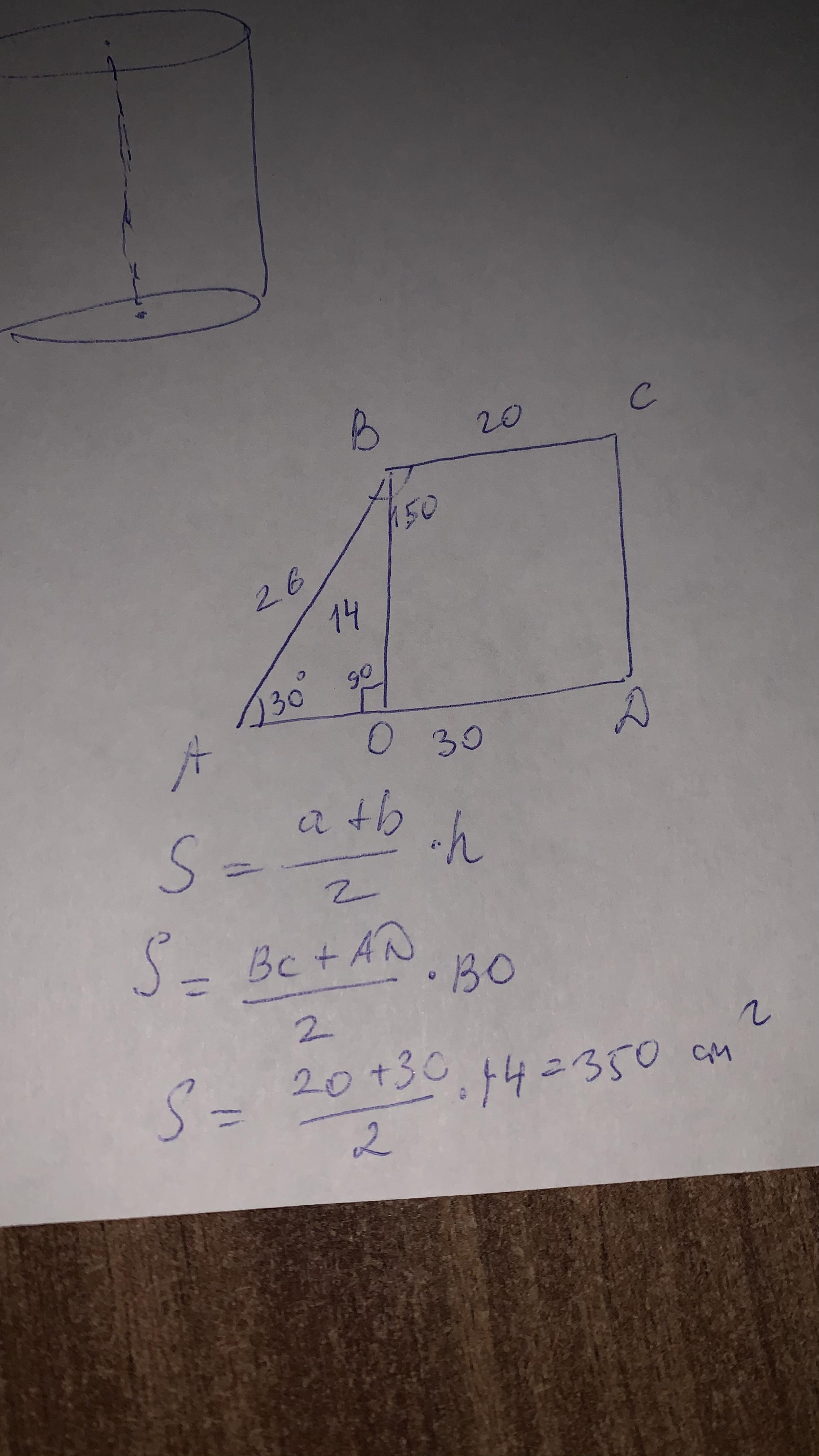 Объяснение: Сумма прилежащих углов в трапеции равна 180*. Тк В=150*, то А=30*. Провели высоту ВО. Рассмотрим треугольник АВО (угол ВОА=90*). Катет, лежащий напротив угла в 30* равен половине гипотенузы, значит ВО=0,5ВА=14 см. Формула для площади приложена