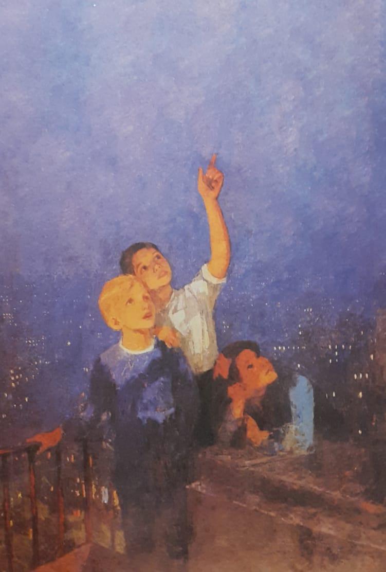 Когда я смотрю на эту картину, у меня внутри все начинает волноваться, мне очень интересно, каково это на самом верху здания увидеть звезды. Наверное, это очень красиво, потому что ты как-будто рядом с ними, ты уже можешь протянуть руку чтобы взять одну из них, но одновременно они так далеко.