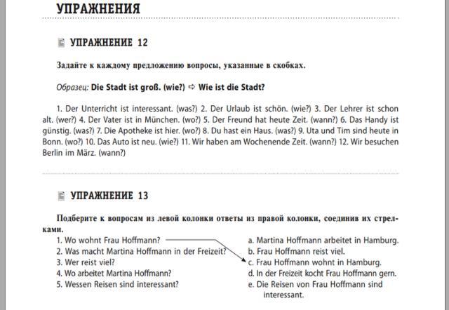 Упр. 12: 1) Was ist interessant? 2) Wie ist der Urlaub? 3) Wer ist schon alt? 4) Wo ist der Vater? 5) Wann hat der Freunde Zeit? 6) Was ist günstig? 7) Wo ist die Apotheke? 8) Was hast du? 9) Wo sind heute Uta und Tim? 10) Wie ist das Auto? 11) Wann haben wir Zeit? 12) Wann besuchen wir Berlin?