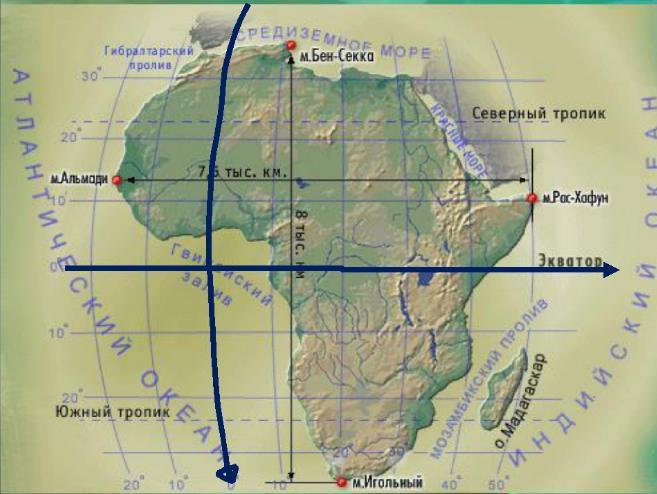 2. Африку пересекает экватор и нулевой меридиан.Верно.