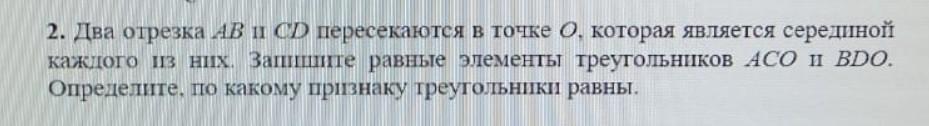 2 отрезка AB и CD пересекаються в точке О которая являеться серединой каждого из них Запишите равные элементы треугольников