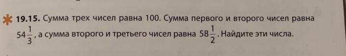 19.15. Сумма трех чисел равна 100. Сумма первого и второго чисел равна 54 1/2. а сумма второго и третьего чисел равна 58 1/2 . Найдите эти числа.