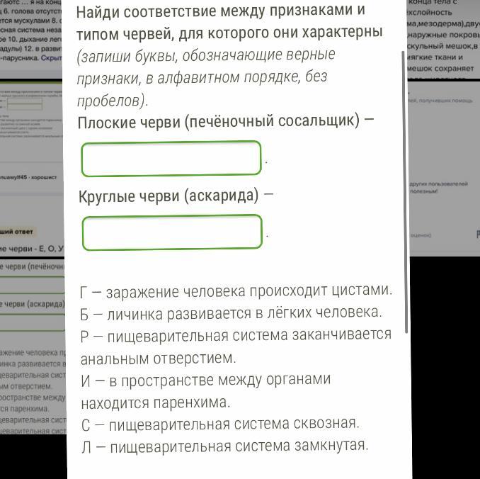 Плоские черви (печёночный сосальщик) - заражение человека происходит цистами (г), пищеварительная система замкнутая (л), в пространстве между органами находится паренхима (и).