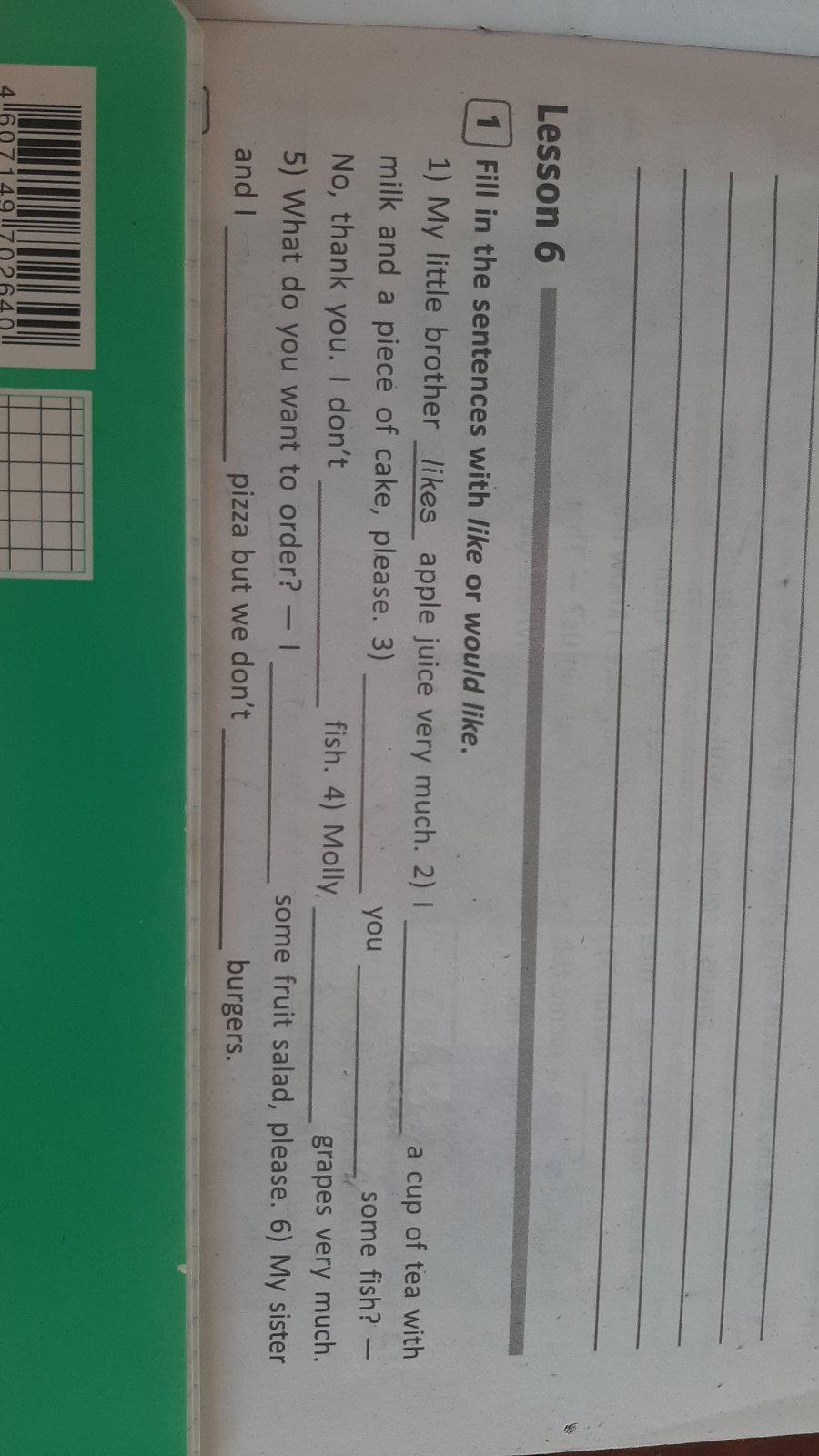 1 Мой младший брат очень любит яблочный сок. 2 я ______ за чашечкой чая с молоком и кусочек торта, пожалуйста. 3 _____ Вы _______ Рыбы?-- Нет, спасибо. Я не ______ рыбы. 4 Молли _ _ _ _ _ винограда очень много. 5 Что вы хотите заказать? - Мне , пожалуйста, фруктового салата. 6 моя сестра и я _ _ _ _ _ пицца, но мы не _ _ _ _ гамбургеры
