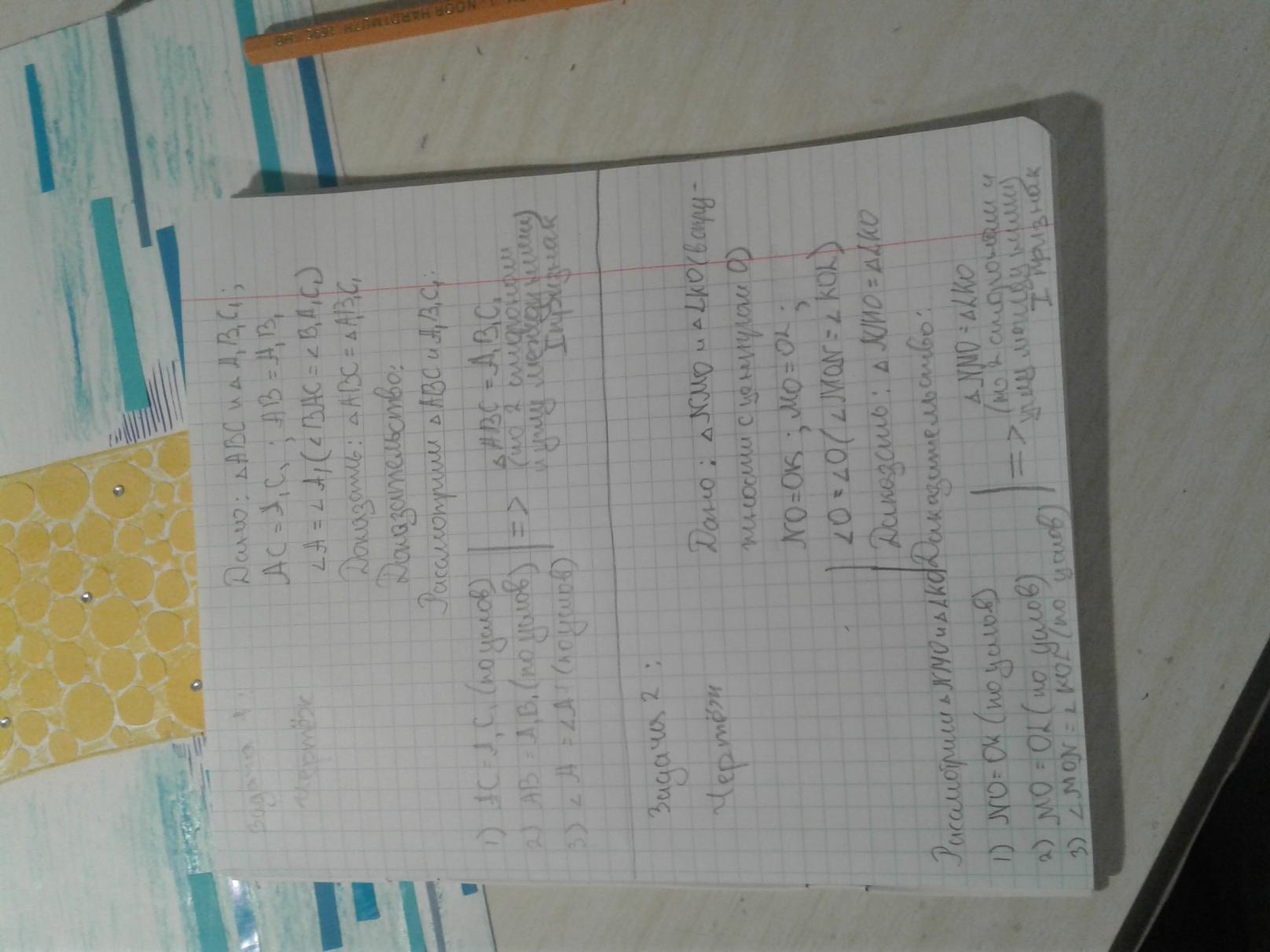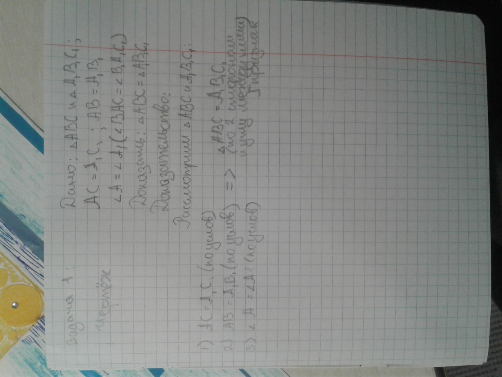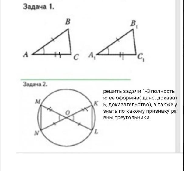 решить задачи 1-3 полностью ее оформив( дано, доказать, доказательство), а также узнать по какому признаку равны треугольники