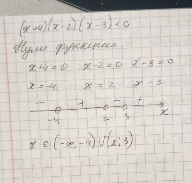Решите неравенство (х+4)(х-2)(х-3)<0 и прикрепите фото решения.