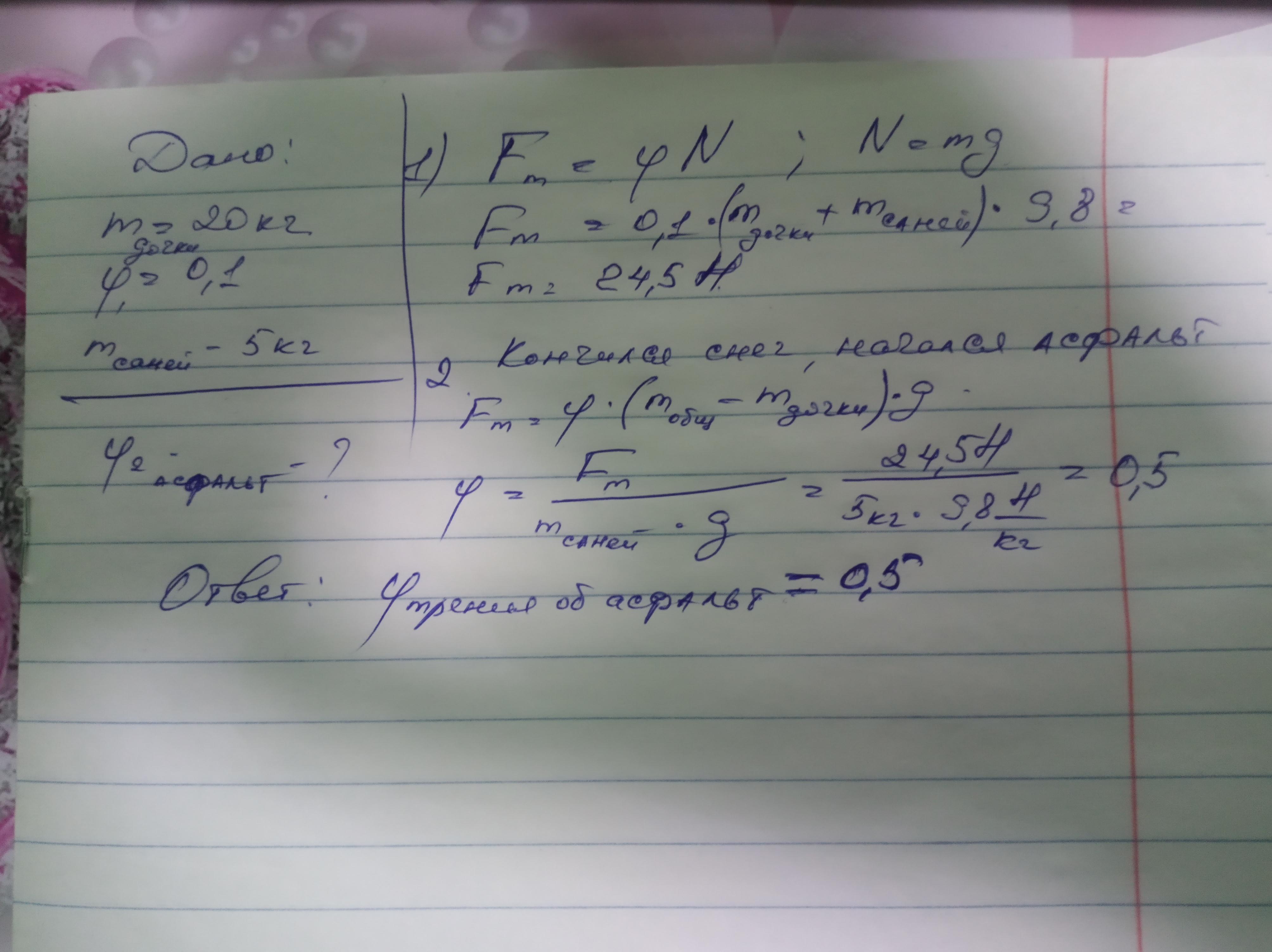 Сначала мама равномерно влезла дочку массой 20кг в санках по горизонтальному снегу,преодолевая некую силу трения. Но затем снег кончился и начался асфальт. Чтобы двигаться дальше, дочке пришлось встать с санок, а мама потащила санки массой 5 кг по асфальту преодолевая точно такую же силу трения . Считая коэффициент трения санок о снег равным 0,1, определите коэффициент трен санок об асфальт.