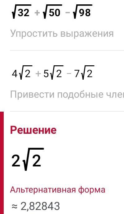 1) √32 + √50 - √98 = 4√2+ 5√2 - 7√2 = 2√2