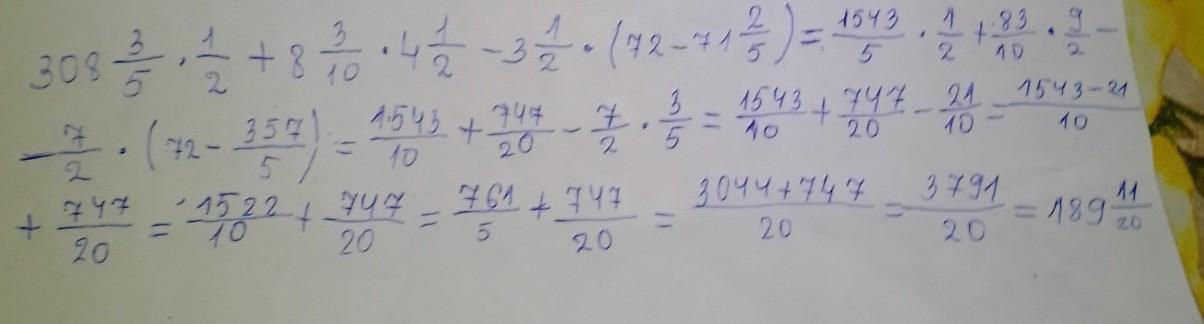значение выражения: 308 3/5•1/2+8 3/10•4 1/2-3 1/2•(72-71 2/5)