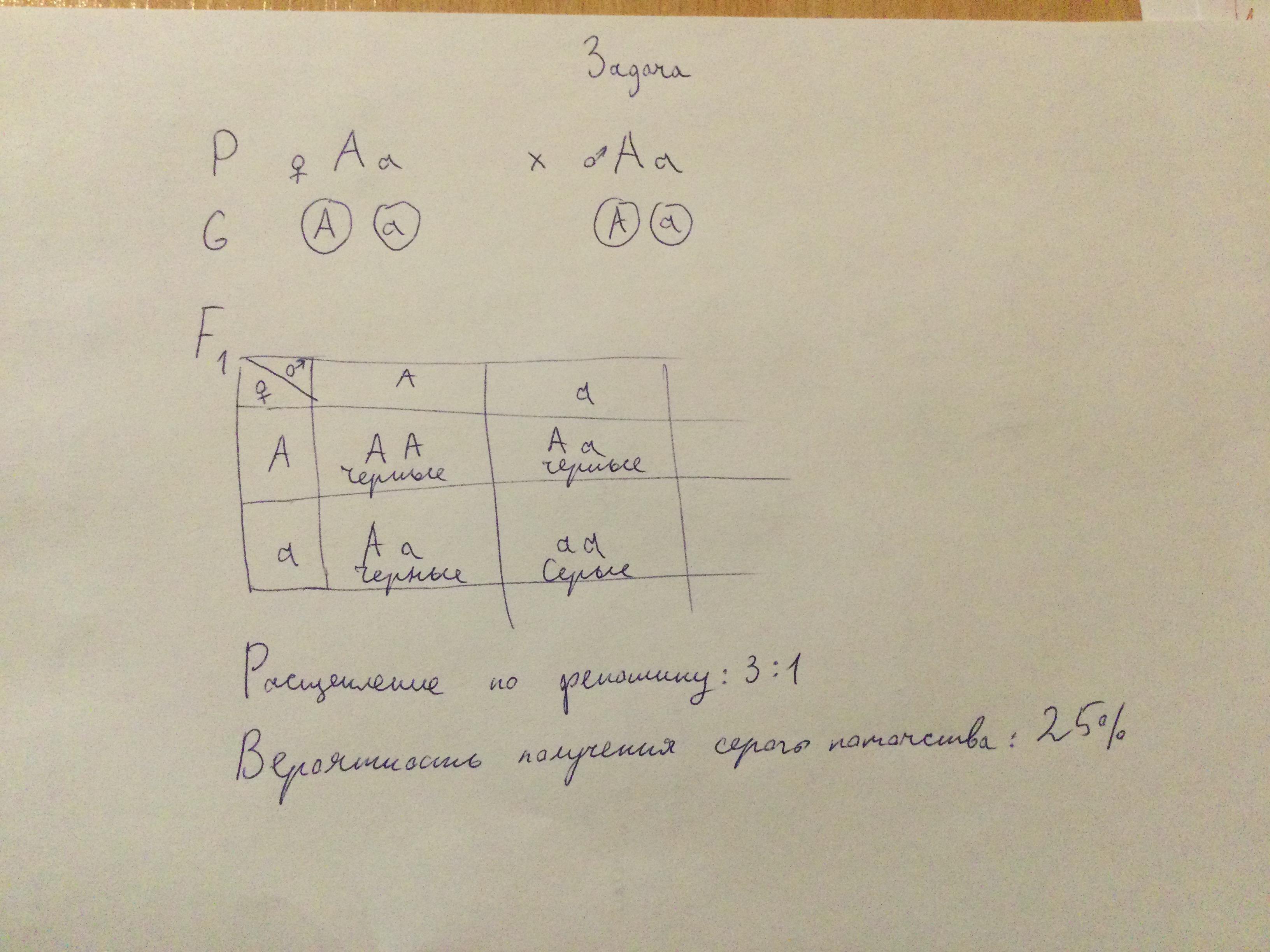 У кроликов черный окрас доминирует над серым, после скрещивания двух гетерозиготных особей было получено серое потомство, определить генотипы родителей и потомства, а также вероятность получения серых кроликов.