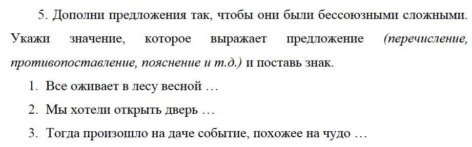 Укажи значение, которое выражает предложение (перечисление, противопоставление, пояснение и т.д.) и поставь знак.