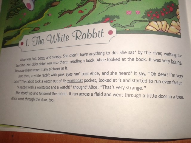 Алисе было жарко, скучно и хотелось спать. Ей было нечего делать. Она сидела * у реки, ожидая чаепития. Ее старшая сестра была так же там, читая книгу. Алиса взглянула в книгу.Она была очень скучной, потому что в ней не было картинок. Только потом, белый кролик с розовыми глазами пробежал мимо Алисы, и она услышала, как он сказал , о-о, дорогая! я очень опаздываю! Кролик взял часы из его кармана жилетки, посмотрел на нее и побежал еще быстрее. кролик в жилетке и часами! - подумала Алиса. это очень странно. там нора за дверью . он шел прямо вниз, как глубокий колодец, и Алиса падала вниз и вниз. она падала очень медленно, и в течение очень долгого времени. я, должно быть, недалеко от центра земли, - подумала она . вдруг она приземлилась на какие-то палки и сухие листья. Алиса встала и осмотрелась по сторонам. она увидела белого кролика бежащего вниз в туннель, побежала за ним. о, мои ушки и усики !я так опаздываю ! - сказал кролик.