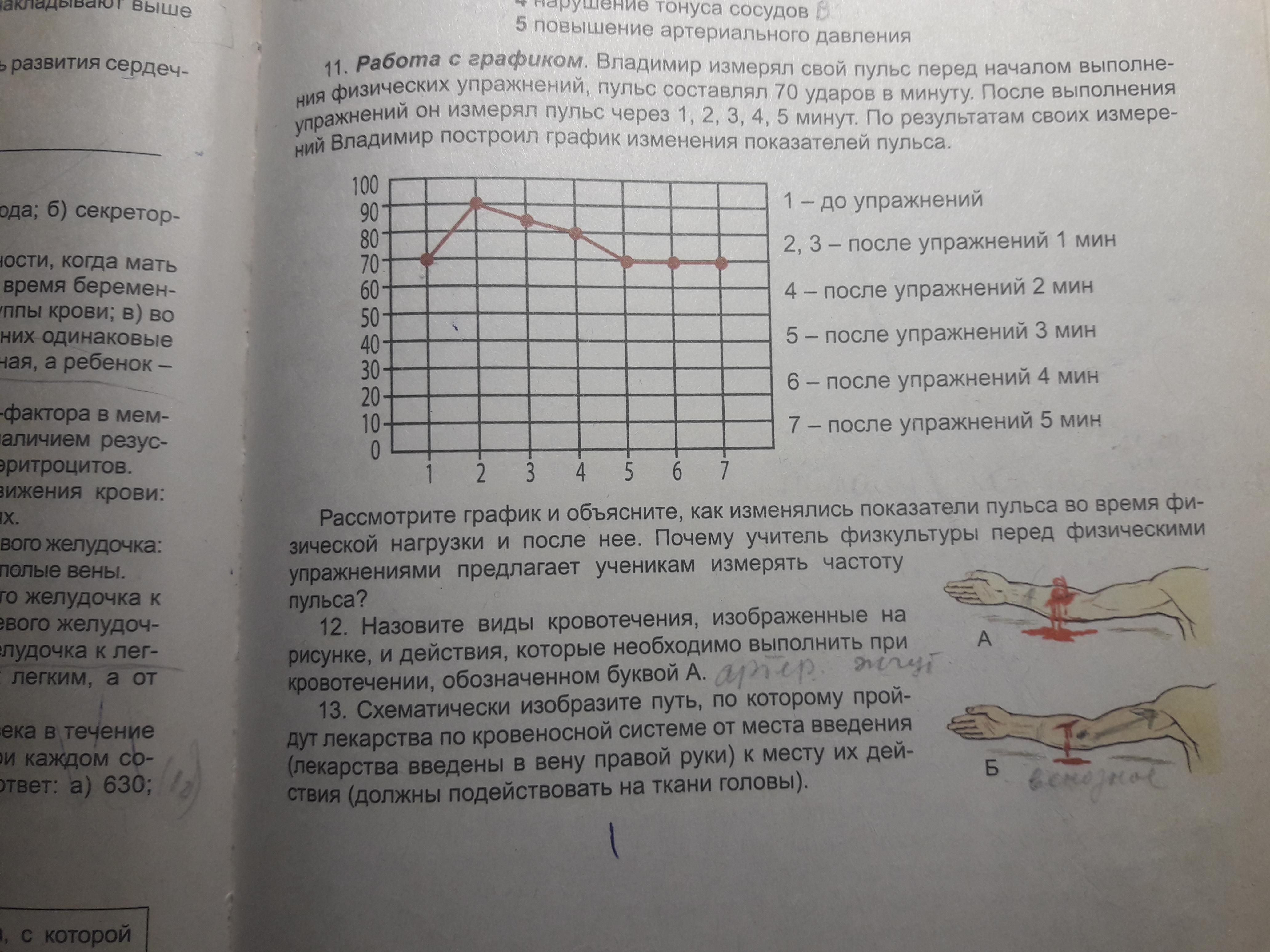 11. При физической нагрузке пульс учащается. По графику можем увидеть максимальное количество ударов на вторую минуту - 90,что является нормой при нагрузке. После нагрузки быстрый ритм сохраняется в течении некоторого времени.