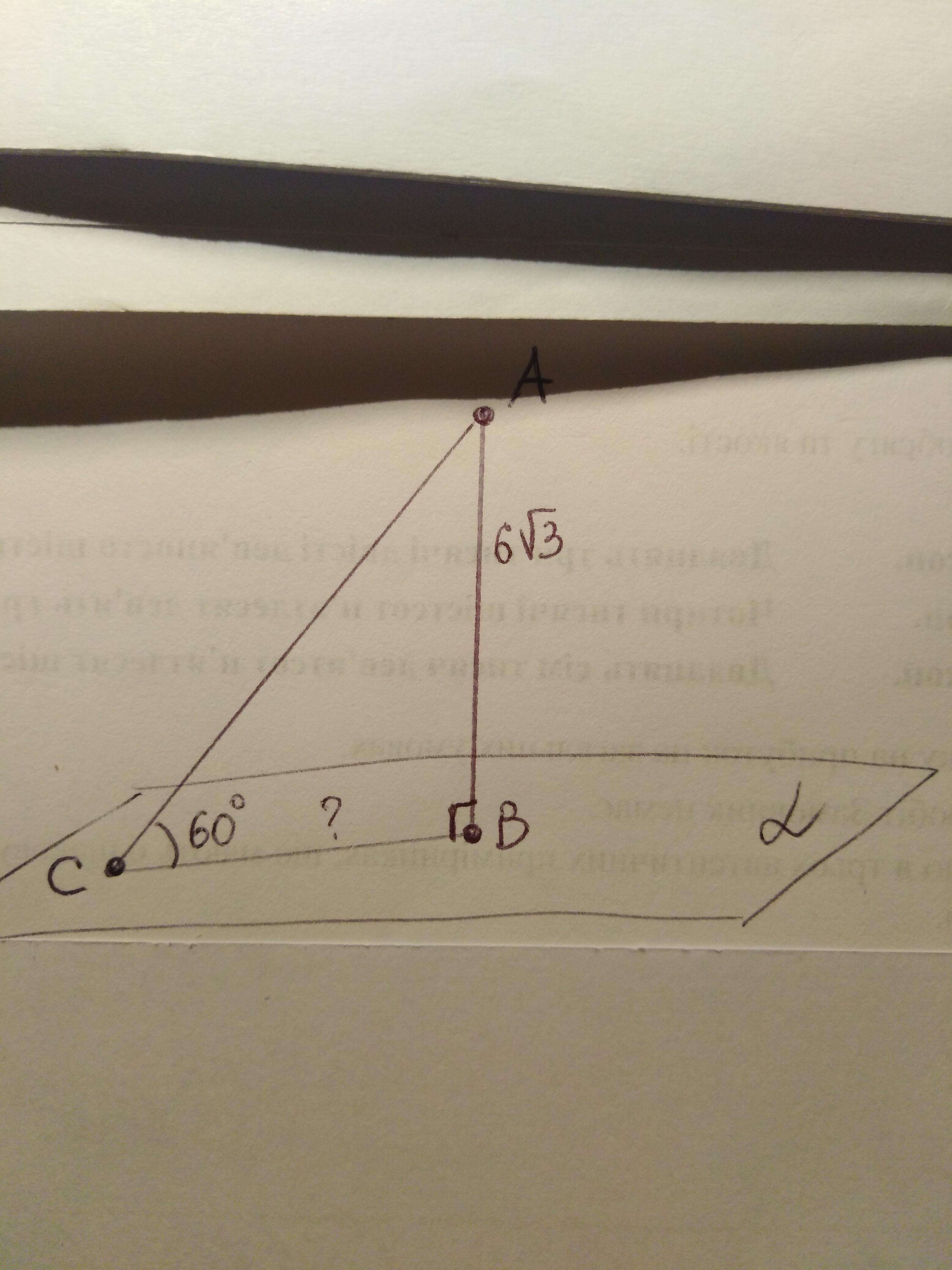 Точка А віддалена від площини на відстань 6√3см. Обчислити довжину проекції похилої, якщо кут між нею та похилою дорівнює 60°. У відповідь запишіть ТІЛЬКИ ЧИСЛО. *