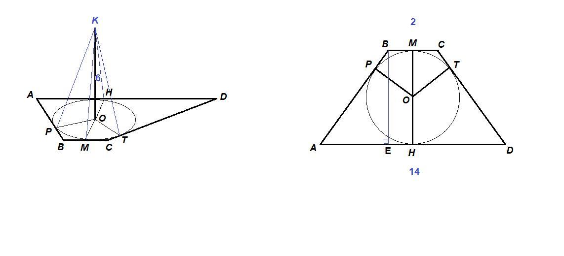 Основи рівнобічної трапеції дорівнюють 2 см і 14 см . Через центр О кола , вписано в цю трапецію, проведено перпендикуляр ОК до площини трапеції , ОК-6см. Знайдіть відстань від точки К до сторін трапеції .