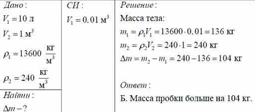 Ответ 1 м3 пробки тяжелее 10 литров ртути на 200-135=65 кг