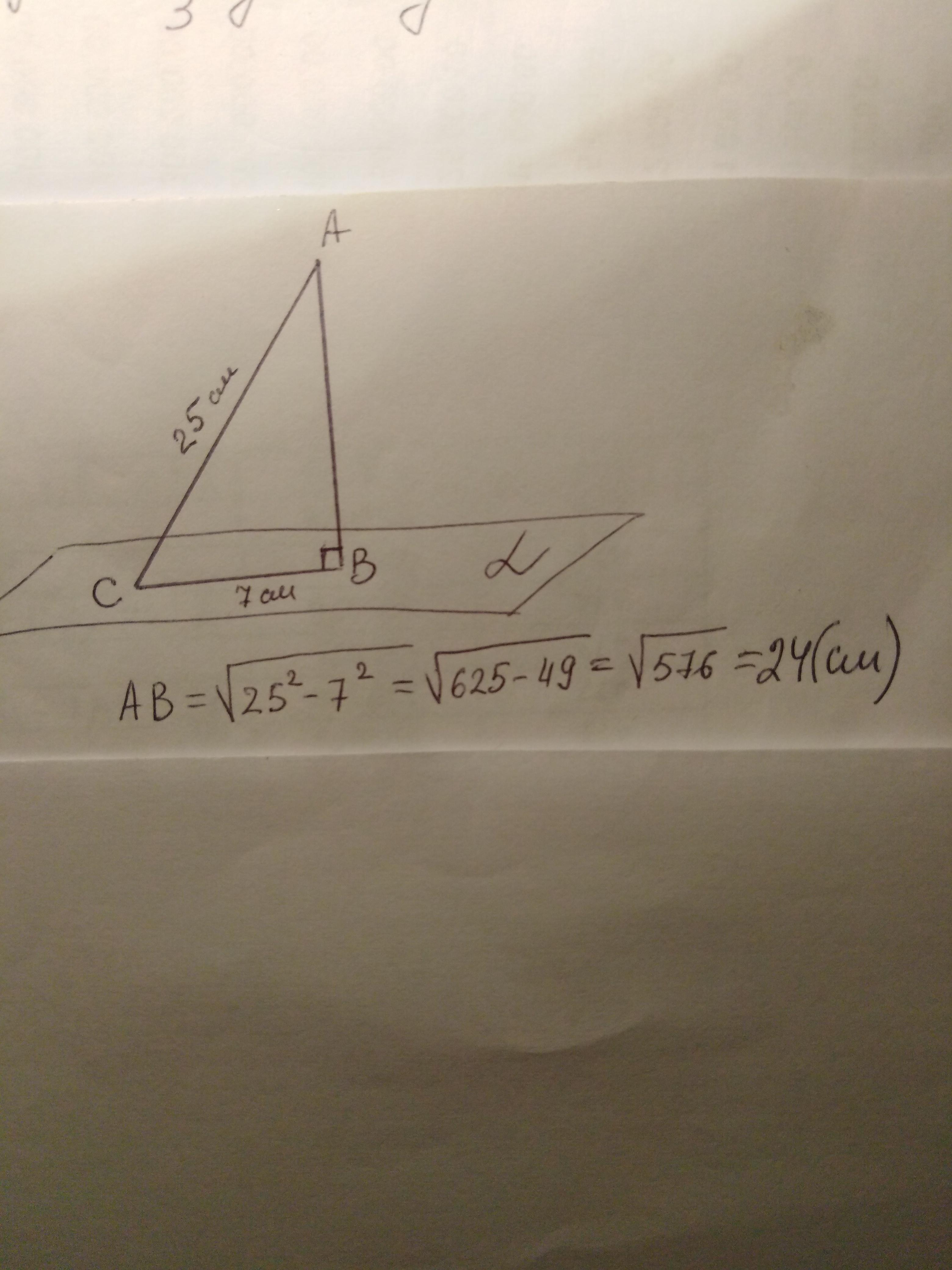 К плоскости α проведена наклонная, длина которой равна 25 см, проекция наклонной равна 7 см. На каком расстоянии от плоскости находится точка, из которой проведена наклонная?