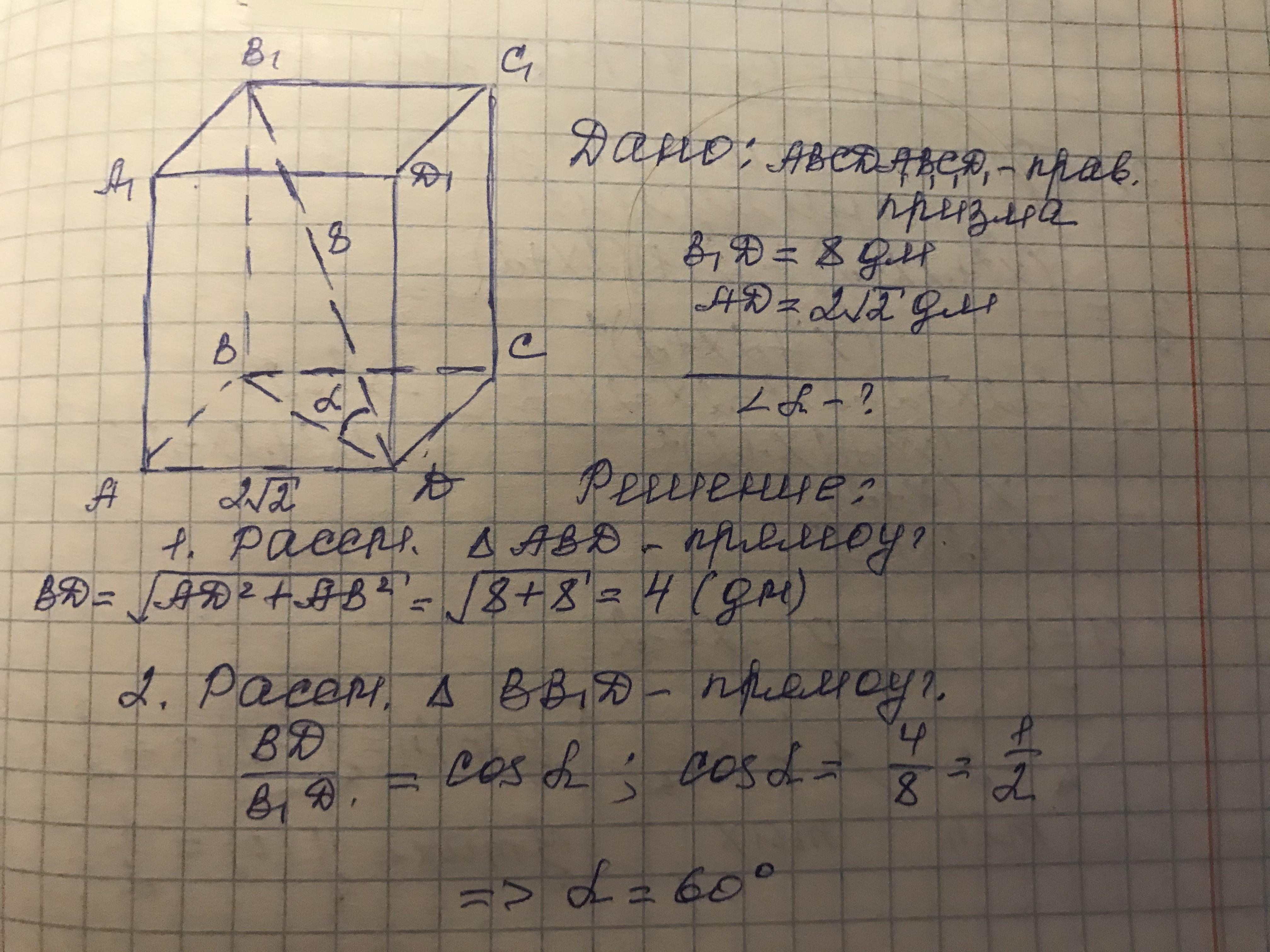диагональ правильной четырехугольной призмы 8 дм. Вычисли угол между диагональю призмы и с плоскостью основания, если ребро основания призмы