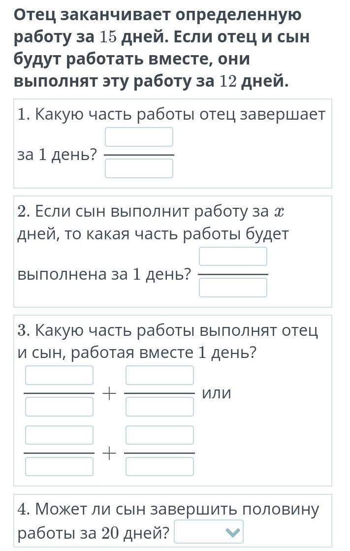 3) 1/15 + 1/х = х/15х + 15/15х = (х + 15) / 15х - часть работы, которую выполнят отец и сын, работая вместе 1 день.