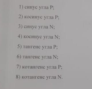 Дан прямоугольный треугольник MNP с прямым углом P. Установите соответствия между отношениями сторон и тригонометрическими функциями острого угла: