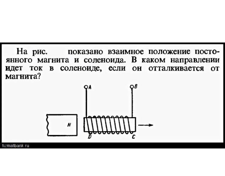 На рис. показано взаимное положние постоянного магнита и соленоида. В каком направлении идет ток в соленоиде