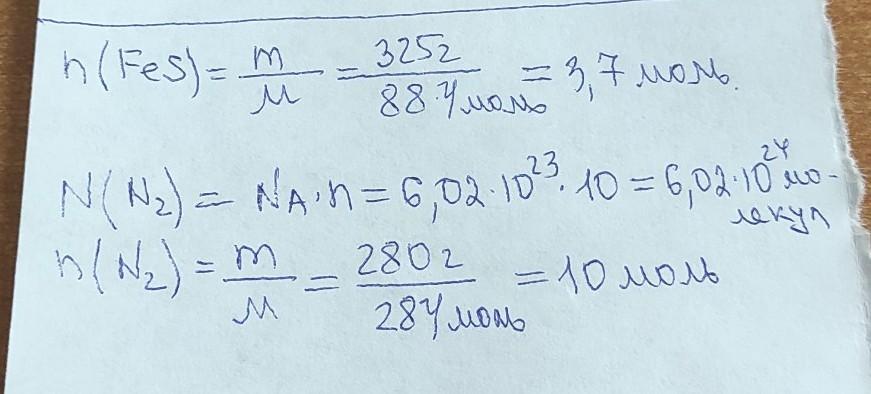 Какое количество вещества содержится в сульфиде железа (II) FeS массой 325 г. Сколько молекул содержится в 280 г азота N2