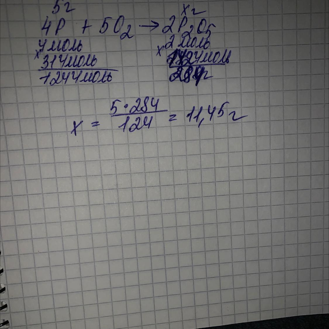 В результате взаимодействия красного фосфора с кислородом образуется оксид фосфора (V) - вещество белого цвета.4Р + 5О2 = 2Р2О5. Сколько граммов оксида фосфора образуется из фосфора массой 5г?