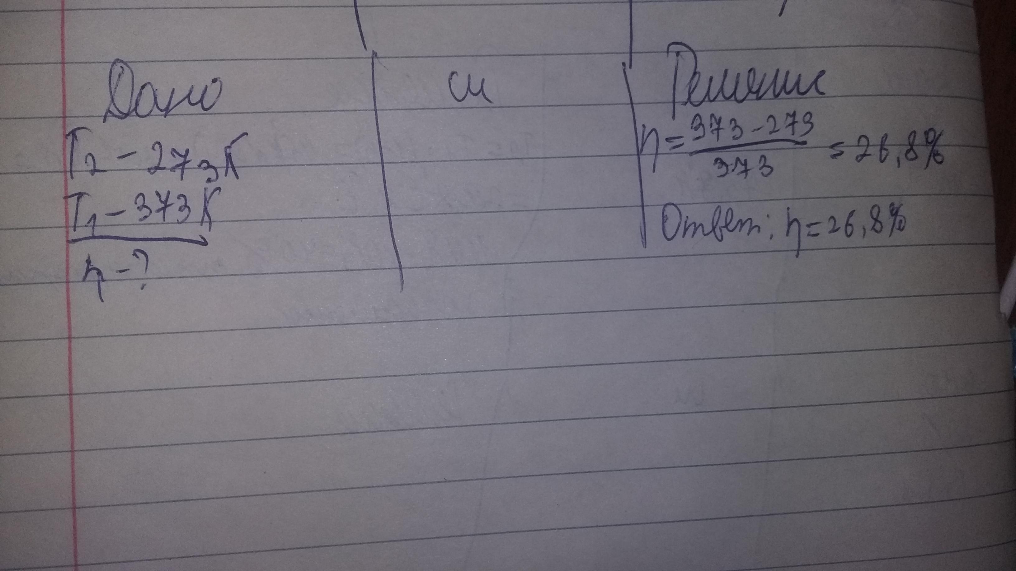 в тепловом двигателе температура холодильника составляет 273 к а температура нагревателя составляет 373к, определите максимальный возможный КПД такого двигателя (в %)