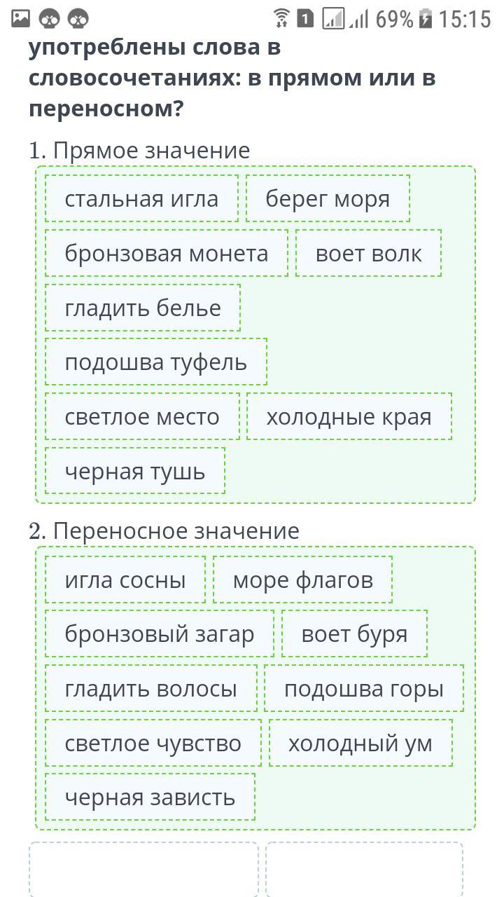 Определи, в каком значении употреблены слова в словосочетаниях: в прямом или в переносном?