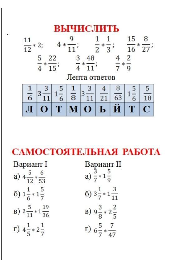 11/12×2=1 5/6 T 3/4×48/11=3 3/11 O 4/7×2/9=8/63 Й