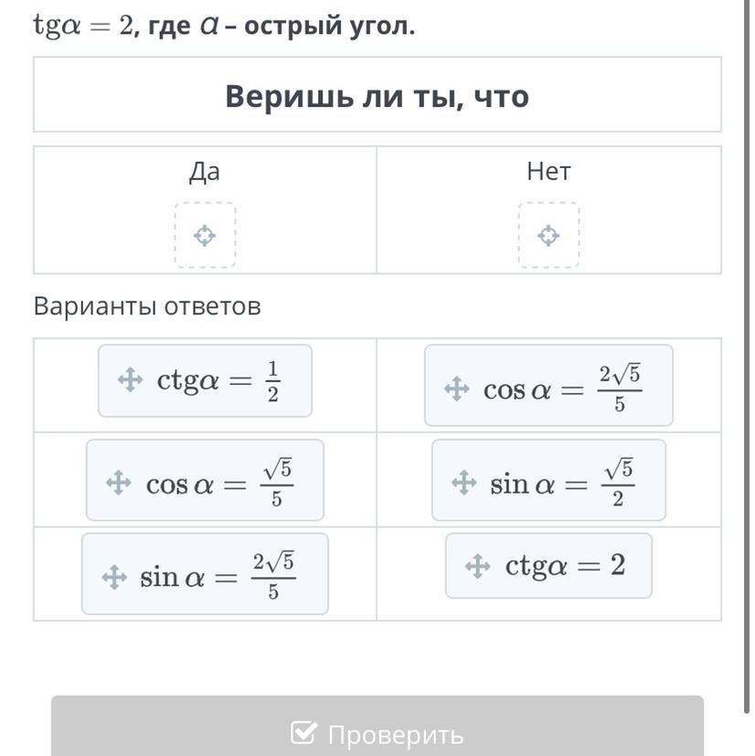 stga=1/2, cos a =5/5 sina 2/5/5 это правильно другие 3 не правильные