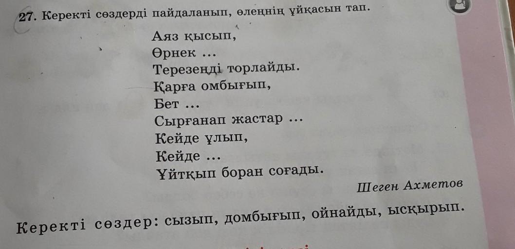 27. Керекті сөздерді пайдаланып, өлеңнің ұйқасын тап